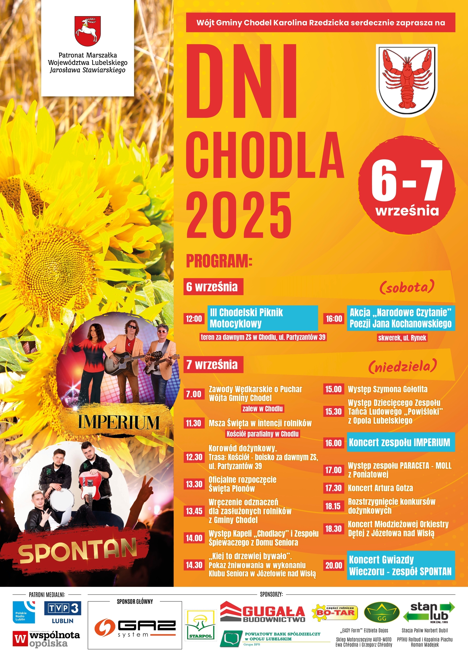 Sobota upłynie nam pod znakiem III Pikniku Motocyklowego i Narodowego Czytania poezji Jana Kochanowskiego. Z kolei niedziela to Otwarte Zawody Wędkarskie o Puchar Wójta Gminy Chodel oraz Święto Plonów, które organizujemy pod Patronatem Narodowym Prezydenta RP Karola Nawrockiego. Patronat honorowy objął Marszałek Województwa Lubelskiego Jarosław Stawiarski, za co serdecznie dziękujemy.